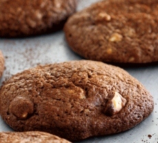 Klop de boter met de suiker, vanillesuiker en cacaopoeder romig en klop er dan één voor één de eieren door. Zeef de bloem en bakpoeder erboven en klop dit er goed doorheen. Voeg de chocolade en amandelen toe en roer alles goed om. Zet afgedekt met plasticfolie een half uur in de koelkast om op te stijven. Verwarm de oven voor op 180°C. Bekleed twee bakplaten met bakpapier. Verdeel het deeg in balletjes ter grootte van een walnoot en druk ze op de bakplaat met de palm van de hand plat. Laat genoeg ruimte tussen de koekjes want ze lopen erg uit. Bak de koeken in circa 15 minuten hard aan de randen en zacht van binnen. Laat ze even afkoelen.