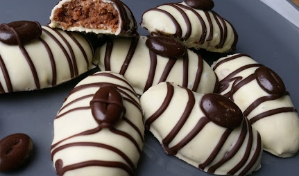 Meng bloem met cacao, suiker en vanillesuiker. Roer het kokende water door het zakje cappucinopoeder. Snijd de boter in blokjes en wrijf door de bloem, voeg ook de koffie toe en meng alles tot een samenhangende deegbol. Maak hier kleine bolletjes van ter grootte van een olijf en rol die tot staafjes. Leg op een bakplaat met bakpapier en bak ze op 200 graden ca 15 minuten en laat ze afkoelen op een rooster. Smelt de witte chocolade au bain marie met de olie en dompel hierin de koekjes. Smelt ook de pure chocolade en doe in een boterhamzakje, knip een heel klein puntje eraf en spuit lijntjes over de koekjes. Doe dan nog op elk koekje een mokkaboontje en laat de chocolade hard worden in de koelkast.