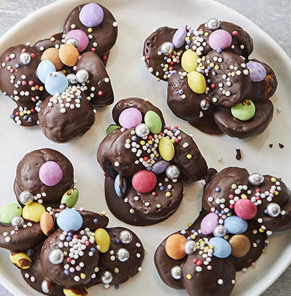 Bekleed een dienblad of bakplaat met bakpapier. Breek de chocolade in stukjes en doe ze in de kom. Breng in een pan een laag water aan de kook. Zet de kom met chocola in de pan en laat al roerend de stukjes chocolade smelten tot een egale saus. Neem de kom uit de pan met water en zet hem op een dubbelgevouwen doek. Schep de kruidnoten voorzichtig door de gesmolten chocolade en laat 1 minuut intrekken. Schep met een lepel bergjes van kruidnoten gehuld in chocolade op de bakplaat met bakpapier. Strooi meteen de smarties over de rotsjes en druk ze een beetje aan. Strooi vervolgens wat disco-decoratie en/of zilveren parels over de rotsjes. Zet het blad op een koele plaats en laat de rotsjes in ca. 30 minuten weer stevig worden.