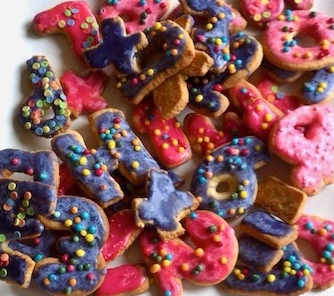 Klop de boter en suiker in een kom luchtig en klop in een andere kom de eieren los. Voeg het suiker- en botermengsel toe aan de eieren en zeef boven de kom de bloem, het bakpoeder en het zout. Kneed tot een stevig deeg (als het iets te nat is voeg dan wat extra bloem toe). Wikkel het deeg in plasticfolie en laat het 1 uur rusten in de koelkast. Verwarm de oven voor op 180 graden en bekleed een bakplaat met bakpapier. Rol het deeg uit tot een plak van ongeveer 5 mm dik en steek met cijfer- en lettervormpjes koekjes uit het deeg of snijd ze zelf. Leg ze op de bakplaat en bak de koekjes in ongeveer 10 minuten gaar, totdat ze iets lichtbruin zijn. Laat de koekjes even afkoelen op de bakplaat. Voor het glazuur meng je de poedersuiker met het water en eventueel de kleurstof, bestrijk hier de afgekoelde koekjes mee en versier ze met verschillende sprinkles.