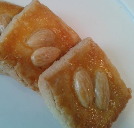Mix de boter met de suiker, zout en eidooier tot een crème. Meng bloem en fijngemalen amandelen erdoor en vorm er een deeg van. Verpak in plastic folie en laat een uur in de koelkast rusten. Rol het daarna uit op een met bloem bestoven werkvlak tot een plak van een halve cm dik. Snijd in 20 vierkantjes (eventueel overgebleven deeg opnieuw uitrollen en snijden) en leg ze op een bakplaat met bakpapier. Druk in elk vierkantje 2 (halve) amandelen. Bestrijk de koekjes met het eidooiermengsel en bak ze in een voorverwarmde oven van 200 graden ca 10-15 minuten. Laat ze afkoelen op een rooster en bewaar ze in een goed afgesloten trommel.