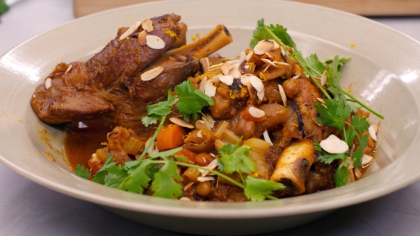 Schep een beetje bloem in een schaal en kruid ze met een snuif zout en wat peper van de molen. Wentel de schenkels doorheen de gekruide bloem, tot er een dun laagje rondom de stukken lamsvlees kleeft. Verhit een ruime stoofpot op een matig vuur. Schenk er een scheut olijfolie in en leg de schenkels in de hete olie. Laat het vlees bakken. Draai de stukken vlees na zo’n 4 minuten om. Geef de schenkels rondom wat kleur. Spoel intussen de stengels selder schoon. Snijd het meeste loof weg. Snijd de stengels in stukjes van zo’n centimeter breed. Pel de uien, snijd ze eerst in helften en vervolgens in grove snippers. Kneus en pel de look en snijd de tenen in stukjes. Schil de wortelen. Snijd ze eerst overlangs in twee en vervolgens in halve rondjes van een centimeter breed. Schep het voorgebakken vlees uit de stoofpot. Leg de schenkels op een bordje, terwijl je de groenten stooft. Doe de stukken ui, selder en wortel in de stoofpot. Vergeet de fijngesneden teentjes knoflook niet. Stoof ze in het bakvet van de schenkels. Roer af en toe even in de pot. Schil het stukje gember en rasp de knol fijn. Roer de verse gember door de stovende groenten. Snijd de gedroogde abrikozen middendoor. Doe de zoetzure vruchten in de stoofpot en roer. Laat de groentemengeling nog een dikke 5 minuten stoven, terwijl je af en toe roert. Verwarm de oven voor tot 150°C. Begin met een flinke snuif ‘ras el hanout’. Vul de specerijenmix aan met een snuif komijnpoeder en korianderpoeder. Voeg een kaneelstok toe en een voorzichtig toefjes harissa. (Deze Tunesische hete saus is extreem pittig, dus naar smaak.) Roer de specerijen door de groenten. Om de bereiding te karamelliseren gaat er wat honing bij. Roer en laat alles nog heel kort stoven. Open de blikken met tomatenstukjes en giet de inhoud in de stoofpot. Spoel de blikken uit met een scheutje water en voeg ook dat toe. Giet de kikkererwten in een zeef en spoel ze kort onder een straal koud water. Giet de kikkererwten in de pot en zet het vuur wat zachter. Voeg extra water toe en schraap met een houten spatel over de bodem, zodat alle smakelijke bakresten losweken. Leg de voorgebakken schenkels in de kruidige groentenstoofpot. Zet de bereiding in de voorverwarmde oven van 150°C. Laat het vlees 2 uur garen, tot het zo mals is dat het van het bot valt. Garneer met amandelschilfers, sinaasappel schilrasp en korianderblaadjes. Lekker met couscous.