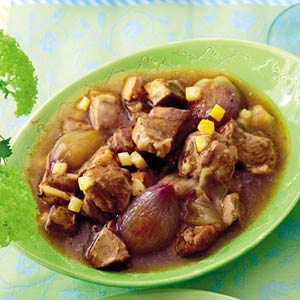 600 gram lamspoulet, 500 gram grote spruiten, 50 gram geweekte parelgort, 1 grote gesnipperde ui, 2 teentjes geperste knoflook, 50 gram boter of margarine, 2 zure moesappels in blokjes gesneden, ½ eetlepel kerrie, ½ theelepel rozemarijn, ½ theelepel tijm,¼ theelepel gemalen kummelzaad, ½ theelepel gemalen foelie, 2 laurierblaadjes, ¼ theelepel selderijzout, zwarte peper, zout, 2 deciliter rode wijn.