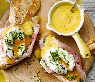 Snijd de pistolets open en beleg ze met de achterham. Snijd de bieslook fijn en rasp de schil van de citroen. Smelt de boter in de magnetron in een maatbeker. Scheid 4 eieren. De eidooiers gebruik je wel en het eiwit niet. Schenk 2 el witte balsamicoazijn samen met de witte wijn in een steelpannetje en kook 10 minuten. Breng een andere pan met een laagje water aan de kook. Leg een hittebestendige kom bovenop de pan, de kom mag het kokende water niet raken. Voeg het witte wijnmengsel uit de steelpan samen met de 4 eidooiers en de citroenrasp in de kom bovenop de pan met het kokende water (dit heet au bain marie). Blijf het mengsel net zo lang kloppen totdat er een dikkere massa ontstaat. Voeg scheutje voor scheutje de gesmolten boter toe, totdat de saus de boter heeft opgenomen. Haal de saus van het vuur, breng op smaak met zout en peper en dek af met folie. Voeg 3 el balsamicoazijn toe aan het kokende water, draai het vuur laag zodat er geen bubbels meer in het kokende water te zien zijn. Maak met een lepeltje een draaikolkje in het water. Breek een ei boven het kolkje (dit heet pocheren). Laat het ei 4 minuten garen, totdat het eiwit stevig is. De dooier mag zacht blijven. Haal voorzichtig het gepocheerde ei uit de pan en hou warm in een diep bord met lauwwarm water. Herhaal het pocheren met de resterende 3 eieren. Serveer de gepocheerde eieren op de belegde pistolets met de saus. Garneer met de bieslook en serveer direct.