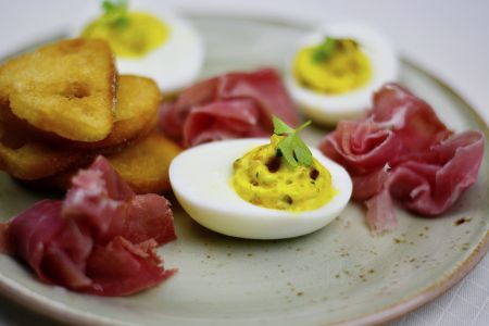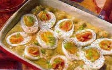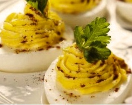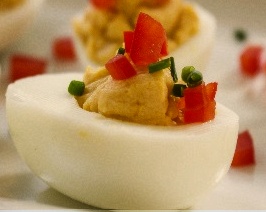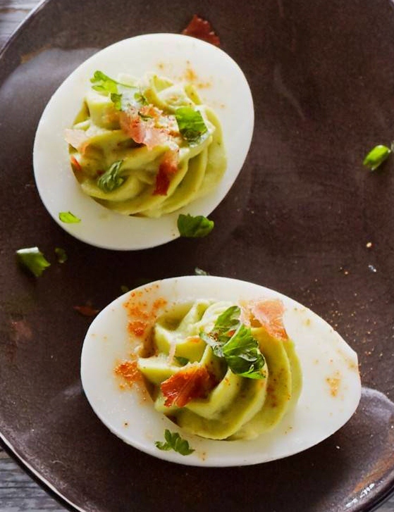 De vulling: Klassiek gevulde eieren met een lepeltje mayonaise, een beetje cayennepeper of paprikapoeder en bieslook of peterselie heerlijk zijn. Avocado. Maak een crème van avocado door het rijpe vruchtvlees in een keukenmachine glad te mixen met de eidooiers. Breng op smaak met flink peper, zout, een klein teentje knoflook en een beetje citroensap. Blauwe kaas. Een stukje blauwe kaas met in stukjes gehakte bacon, zongedroogde tomaat of grofgehakte kruiden als koriander, dille en basilicum.