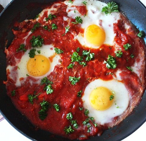 400 gram tomatenblokjes, 1 el tomatenpuree, 1 rode paprika (geel of groen kan ook, als je wat meer kleur in je gerecht wilt), 1 ui, 1 tn knoflook, 1 tl cayennepeper, 1 tl komijnzaad, 1 tl chilipoeder, 1 tl paprikapoeder, 1 flinke hand peterselie, 4 eieren.