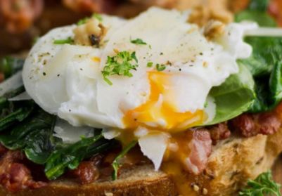 Scheutje witte wijnazijn, 80 gr walnoten, 100 gr bacon, 200 gr verse spinazie, 4 eieren, 4 sneetjes brood, 4 el geraspte Parmezaanse kaas,