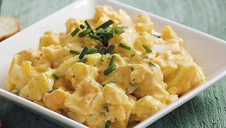 4 eieren, 1 tl mosterd, 2 el griekse yoghurt, 1 klein sjalotje, Snufje paprikapoeder, Snufje kerriepoeder, peper en zout, Bieslook fijngehakt.