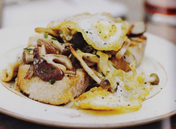 4 el olijfolie, 4 kwarteleitjes,4 el boter, 1 tn knoflook geperst, 400 gr gemengde wilde paddenstoelen schoongemaakt, 3 el droge witte wijn, 4 dikke sneden zuurdesembrood geroosterd, scheutje truffelolie.
