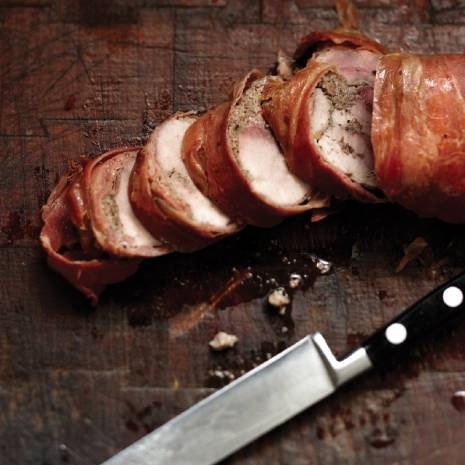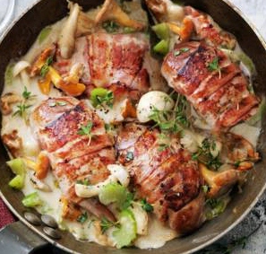 1 fazant (ontbeend), 500 g boleten (grof gesneden), 3 el olijfolie, ½ Spaanse peper (fijn gesneden), 1 el fijn gesneden tijm, 1 knoflookteen (fijn gehakt), 2 el sjalot (fijn gesneden), 2 el witte wijn, 300 g pancetta, peper & zout.
