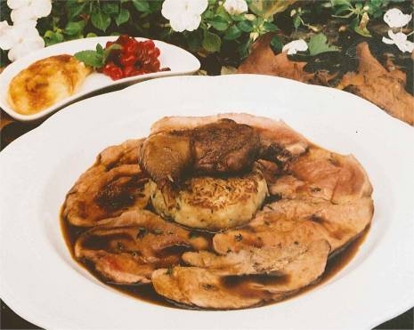 Leg de borstfilets op een snijplank en snijd ze met een scherp mes voorzichtig in, zodanig dat u er “envelopjes” van maakt. Verdeel de paté in 4 porties en vul de envelopjes hier mee. Bestrooi het vlees met bloem, peper en zout en bak de filets om en om aan in hete olie, ongeveer 2 minuten per kant. Haal ze uit de braadpan en zet ze nog een minuut of tien in een oven van circa 150ºC om door te warmen. Bak in dezelfde pan de oesterzwammen, sjalot en tijm beetgaar. Breng op smaak met peper en zout. Flambeer het mengsel met de whisky. Voeg de room toe en laat het geheel tot de helft inkoken. Geef er bijvoorbeeld gestoofde en gekarameliseerde witlof met aardappelkroketjes bij.