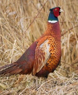 1-2 fazanten, 2 appelen, 4 el Calvados, 100 g rookspek in lange reepjes, 1½ dl rode wijn, 3 el slagroom of koffieroom, 75 g boter of margarine, wildkruiden, zout en peper.