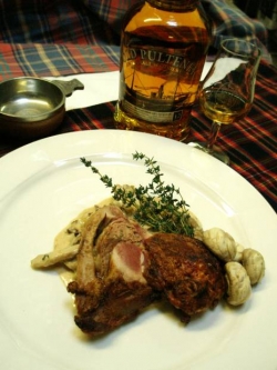 4 borstfilets van fazant, 200 g peperpaté, 200 g kleingesneden oesterzwammen, 1 fijngehakte sjalot, ½ l room, 4 cl single malt whisky 12 y.o., bloem, olijfolie, snufje gedroogde tijm, zout, peper.