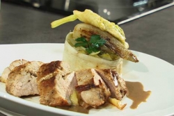4 fazantfilets, ½ l fazantbouillon getrokken van boutjes en karkassen of kant-en-klaar gekochte wildbouillon, 200 g spruitjes (klassiek mals gekookt in gezouten water), 1 daikon (Japanse rammenas) of een grote winterwortel, ½ kg witloof fijngesneden, 1 dl room, 1 ui fijngesneden, 1 knoflookteentje geperst, 1 el suiker, 200 g boter, 400 g aardappelen in blokjes gesneden, 100 g reepjes gedroogde Ganda ham, peper, zout, muskaatnoot, in tempura beslag (Japans deeg dat kant-en-klaar in poedervorm kan gekocht worden) gebakken selderblaadjes.