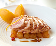 Schil de schorseneren en leg ze onmiddellijk in water met citroensap. Kook ze vervolgens beetgaar in gezouten water waaraan ook het sap van 1 citroen is toegevoegd. Laat afkoelen in koud water en laat uitlekken. Schil de pompoen, verwijder de zaden en snijd in stukken. Doe ze in een kookpot met wat olijfolie en laat zachtjes garen onder deksel tot je een compote hebt. Kruid met peper en zout en voeg wat gebruinde boter toe. Bak de schorseneren in wat boter. Laat ze lichtjes kleuren, blus met het sap van sinaasappel en citroen, laat droog koken en kruid op het laatst met peper en zout. Kruid de fazantenfilets met peper en zout en bak in de pan met wat boter. Haal uit de pan en laat in een ovenschaal gedurende 5 minuten verder garen in de oven op 180 °C. Deglaceer ondertussen de pan met wildfond en laat voor 3/4 inkoken. Voeg de veenbessencompote en de room toe en laat inkoken tot sausdikte. Bak de pommes duchesse in de friteuse op 180 °C.