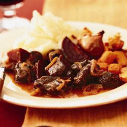 25 g boter 2 el olijfolie, extra vergine 450 g hertenbout of -schouder, in blokjes van 4 cm gesneden 2 uien, circa 300 g in totaal, in plakjes gesneden 2 teentjes knoflook, geperst 2 gekookte rode bieten, circa 125 g in totaal, elk in 6 stukken gesneden fijngeraspte schil en sap van ½ grote sinaasappel 100 ml port 300 ml runderbouillon, 100 g vacuümverpakte, geschilde, hele kastanjes 3 worteltjes, overlangs gehalveerd en in stukken van 2,5 cm gesneden een stuk verse gember van 5 cm, fijngeraspt 4 sjalotjes, ongeschild maar zonder wortelaanzet 1 el patentbloem peper en zout Verwarm de oven voor op 180 °C. Verhit de helft van de boter samen met 1 eetlepel van de olie in een grote vuurvaste schaal. Voeg het vlees in één laag toe en bruin het aan elke kant circa 5 minuten. Draai het eenmaal om. Doe dit eventueel in 2 porties als de schotel te klein is. Haal het vlees met een schuimspaan uit de schaal en leg het opzij op een bord. Doe de uienringen in de pan en roer er goed door. Stoof ze gedurende circa 10 minuten op een laag vuur, of tot de ui enigszins zacht wordt en net een beetje bruin begint te worden. Roer regelmatig door. Voeg de knoflook, de rode bieten en de sinaasappelschil en het -sap toe. Roer goed en voeg dan opnieuw het vlees en zijn sappen toe aan de schaal. Voeg de port en de runderbouillon toe. Breng het geheel aan de kook. Dek de schaal af en zet het gerecht in de oven. Laat 1¼ uur koken of tot het vlees gaar is. Voeg de kastanjes circa 15 minuten voor het einde van de gaartijd toe. Doe ondertussen de worteltjes, de gember en de sjalotjes in een braadslee, voeg de resterende eetlepel olie toe en roer tot de groenten goed zijn bedekt. Zet de braadslee in de oven boven de schaal met het vlees en laat circa 1 uur roosteren. Draai de groenten halverwege de bereidingstijd om. Meng de rest van de boter met de bloem om een smeuïge brij te maken (beurre manié). Zet de schaal met het vlees op een middelhoog vuur en voeg de brij langzaam toe. Klop voortdurend en laat het sudderen tot de jus een beetje dikker is geworden. Breng op smaak. Serveer de hertenstoofpot warm met de geroosterde groenten.