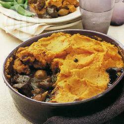 2 el olijfolie, extra vergine 200 g kleine uitjes, geschild en heel gelaten 500 g hertenvlees zonder bot (lende- of schouderstuk) in blokjes gesneden 150 g kleine champignons 3 stengels bleekselderij, in dikke plakjes gesneden 1 el verse tijmblaadjes 300 ml volle rode wijn 150 ml krachtige runderbouillon 1½ tl maïzena zout en peper Aardappelpuree 1 kg zoete aardappelen, in dobbelsteentjes gesneden 1 el grove mosterd geraspte schil en sap van 1 sinaasappel Verhit de olie in een hapjespan en voeg de uitjes toe. Doe het deksel erop en bak de uitjes 8-10 minuten op een laag vuur tot ze rondom lichtbruin zijn; schud de pan af en toe licht heen en weer. Schep de uitjes met een schuimspaan op een bord. Braad het vlees in de pan mooi bruin in 2-3 minuten. Voeg de uitjes, champignons, selderij en tijm toe. Schenk de wijn en bouillon erbij. Breng aan de kook en temper het vuur. Laat met het deksel erop circa 45 minuten sudderen, totdat het vlees gaar is. Stoom ondertussen de dobbelsteentjes aardappel in circa 25 minuten gaar of kook ze 15 minuten in kokend water en giet dan af. Verwarm de oven voor op 190 °C. Pureer de aardappelblokjes in een kom met mosterd, sinaasappelrasp en -sap en zout en peper naar smaak. Zet apart. Leng de maïzena aan met 2 el koud water. Roer dit door het vleesmengsel en laat al roerend iets inkoken. Breng op smaak met zout en peper. Schep de vulling daarna in een bakvorm van 1,2 liter. Verdeel de puree over de vulling, zodat deze volledig bedekt is. Bak ten slotte in 20 minuten goudbruin en serveer warm.