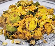 Voor 4 personen: 1,5 kilo zoete aardappel in blokjes, zeezout , gemalen zwarte peper, 3 el zonnebloemolie, 1 el kerriepoeder, 2 el sambal, 1 kg prei gewassen in ringen, 125 ml groentebouillon, 4 el pindakaas, platte peterselie ( 20 gr) grof gehakt, selderijblad (15 gr), 100 gr gezoute pinda's , 6 el gebakken Indische uitjes (bawang goreng)