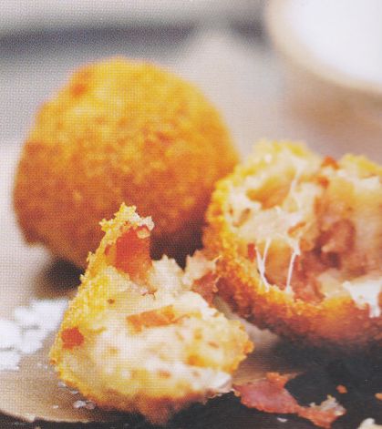 200 gr roomkaas, 100 gr. ricotta, 1,5 tl geraspte citroenschil, 20 ontpitte groene olijven afgespoeld en goed droog, 40 gr vers broodkruim, 80 gr bloem, 1 ei, plantaardige olie, zeezout.