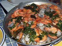 Rooster de paprika's onder de grill tot ze zwart geblakerd zijn. Doe ze in een plastic zak tot het vel loskomt. Verwijder het vel onder stromend water. Snijd varkensvlees en kalfsvlees in blokken en marineer 30 min. in olie, verse koriander, zout en peper. Snijd spek en chorizo in stukken en bak zachtjes. Voeg ui, knoflook, wortel, selderij, en laurier toe en laat glazig worden. Dan de paprikapoeder, tijm en rode peper, de tomaatplakken, blik tomaten en een scheut witte wijn toevoegen. Voeg het vlees toe en schep het om en bak ca 5 min.. Nu de geroosterde paprika's erbij, daarna de garnalen en venusschelpen. De hoeveelheid naar eigen wens bepalen. Breng op smaak met zout en peper. Doe een deksel op de pan en laat 10 min stomen. Controleer hierna op gaarheid, sausdikte en smaak. Doe de deksel er weer op en zet de pan met deksel op tafel.