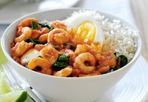 1 kleine ui, 3 eieren, 1 el olijf olie, 2 el balti curry pastei, 400 gr ingeblikte gehakte tomaten, 200 gr diepvries garnalen, 50 gr spinazie, 150 gr rijst.
