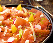 1 volledig gerookte zalm, 1 bos radijs, lente-uitjes, 1 venkel, 1 sinaasappel, 3 el olijfolie, 1 el balsamicoazijn, 3 pepers, 1 potje zure room, peper en zout. Snijd de zalm in dunne plakjes. Snijd de radijzen en de venkel (eventueel met een mandoline) in dunne plakjes. Snipper de lente-uitjes fijn. Maak partjes zonder vel van de sinaasappel. Maak een vinaigrette met olijfolie, witte balsamico en 3 pepers. Doe de zure room in een spuitzak. Werk de zalm af met de venkel, radijsjes, lente- uitjes en eventueel wat verse koriander. Leg hier een paar partjes sinaasappel op. Breng op smaak met de vinaigrette. Spuit enkele kleine bolletjes zure room rondom als afwerking.