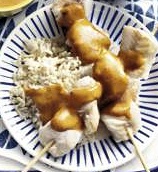 300 gr zilvervliesrijst, 375 gr koolvisfilets, 198 gr mais, 500 gr sperziebonen, 1 el boemboe rode curry, 2 el pindakaas light, 200 ml kokosmelk, 2 el zonnebloemolie, 8 satéprikkers