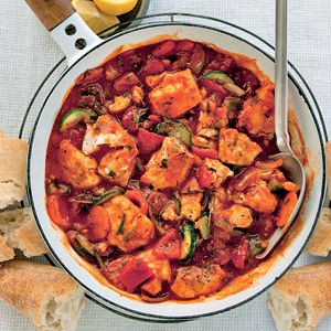 Verhit de olie in een hapjespan en fruit de knoflook 30 sec. Voeg de wokgroente toe en draai het vuur hoog. Bak al omscheppend 2 min. Voeg de wijn, tomatensaus en Provençaalse kruiden toe en breng aan de kook. Snijd de vis in stukjes. Draai het vuur laag en leg de vis in de saus. Stoof afgedekt in 6 min. gaar. Breng op smaak met peper en eventueel zout. Serveer de visstoof met het stokbrood. Lekker met partjes citroen.