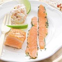 1 eetlepel verse dille fijngesneden, 1 theelepel witte basterdsuiker, 2 stukken Schotse zalmfilet (à 150 gram), 100 gram gerookte zalm in reepjes, ½ bakje ricotta (kaas, à 250 gram), 1 theelepel citroenschil geraspt, 3 el olijfolie, 1 limoen in partjes.