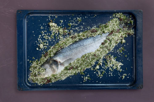 een zeebaars van 2 kilo met vel en schubben er nog op/aan het wit van een ei, 300 gr vers zeewier ingelegd in zout (bv. kombu, nori, dulse, zeesla) of 30 gram gedroogde zeewiermelange 6 el extra vergine olijfolie, 200 gram kerstomaatjes, 2 sjalotjes, sap van 1 citroen, een halve citroen in schijfjes, verse koriander kleingesneden, ½ theelepel gedroogd venkelzaad, 2 kg zeezout, versgemalen peper