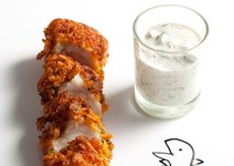 Dep de visfilets droog met keukenpapier en kruid ze met peper en zout naar smaak. Hak de bieslook en peterselie heel fijn, meng 2 el van ieder kruid door de bloem en doe het in een diep bord. Klop in een ander diep bord het ei los met een el water. Verkruimel de cornflakes nog iets fijner in een derde bord. Paneer de vis door ze eerst door de ‘gekruide’ bloem te wentelen, vervolgens door het los geklopte ei en tenslotte door de cornflakes. Verwarm zoveel olie in een diepe koekenpan zodat de bodem van de pan bedekt is, en bak hierin de vis tot het ‘jasje’ krokant en bruin is. Zet ze vervolgens in een voorverwarmde oven van 120 °C gedurende 8 minuten om verder te garen. Maak het sausje door de mayonaise te mengen met de yoghurt. Hak de augurken, de kappertjes en de dille heel fijn. Roer dit door het mayonaise/yoghurtmengsel, maak op smaak met versgemalen peper en zout.